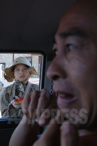 【写真:経済的な生活苦は続く。この数年、物乞いの数が急増しているように感じる。乗り合いバスの発車を待っている間、乗客に向かって施しを求める女性。この女性は、おそらくは私に向かって器を差し出しているのだろう。だが、私の横には僧正が乗っているのだ。日本の人が想像する以上に敬いの対象である僧の真横で、このような行為に出るとは驚きである。さらにもっと驚いたのは、その僧正は、バスが動き出す10分以上もの間、彼女の存在を全く無視していたことである(そういう僧侶もいるのだ)】