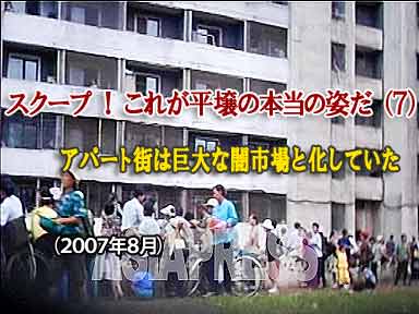 市楽浪区域のアパート街がこんな有様になっていたなんて、北朝鮮人以外の誰が知っていただろう。凄まじい数の人々が、アパートの入口に向か う通路に集まり、物を売っている。目的は、当然現金を得るためである。もっとも待遇がよく、また、もっとも統制の厳しい平壌でも、市場経済が爆発的な拡が りを見せていることが、如実にわかる映像だ。それは誰かに教えられたり、指示されたりしてできものではない。
