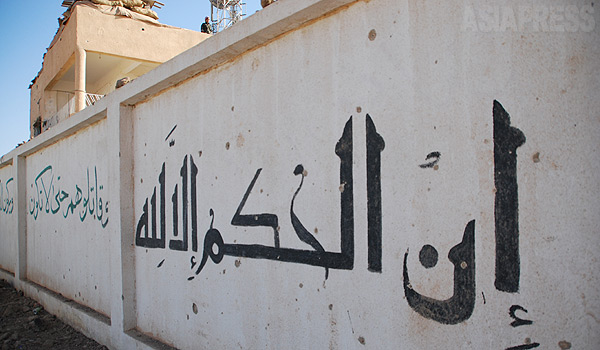 建物の壁にはイスラム国が書いた「アッラーが審判を下す」の文字が残されていた。シリア北東部のたくさんの町や村では、戦闘が続いている。(2014年9月、シリア北東部・玉本英子撮影)