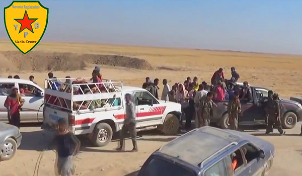 8月3日のシンジャル攻撃から6日後、シリア国境からイスラム国の包囲を破り、脱出路を確保して住民を救出したYPGの部隊。クルディスタン労働者党(PKK)のイラク側の戦闘部隊と連携して突撃作戦を敢行した。写真はYPG・PKKの部隊によって救出され、シリアに搬送、保護されるヤズディ住民たち。(YPG撮影映像より)