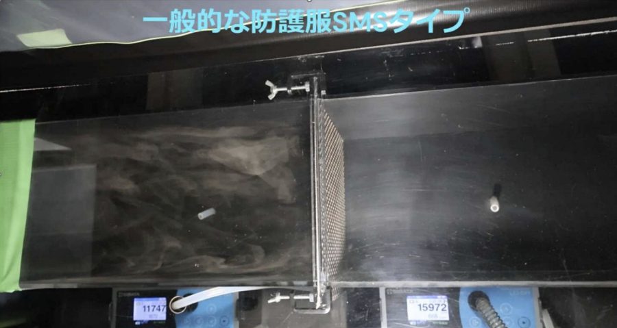 同社が新たに開発したアスガードプロ(SMS素材)とアスガードプロプラス(SF素材)の防護服を紹介。同じくテストしたアスガードプロプラスでは粉じんの透過が見られなかったことも示した。いずれもJIS T 8115適合品(タイプ5・6)で、12月から発売予定という。