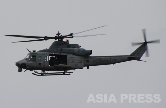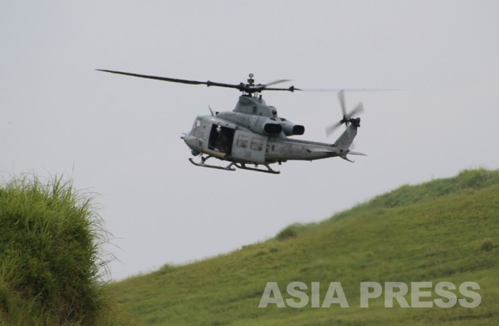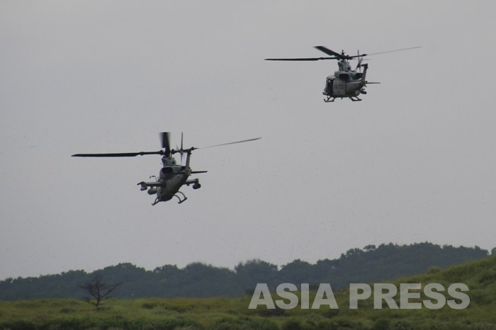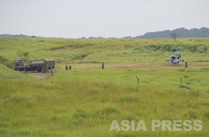 目撃したオスプレイの離着陸・ホバリング・給油・兵員輸送の訓練もその一環だ。オスプレイが飛び去ると、今度は米海兵隊のヘリコプター2機が、大気を引き裂く爆音とともに十文字原演習場に着陸した。