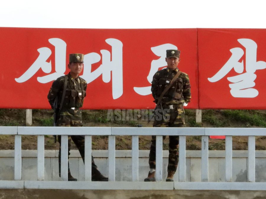 1400キロに及ぶ朝中国境のほぼ全域にわたって張られていた鉄条網は、コロナ・パンデミックを機にさらに厳重に更新された。だが、新築された復興アパート群の前の川辺には設置されていなかった。アパートのすぐ前は中国の観光遊覧船が通り過ぎる場所だ。「有刺鉄線に覆われたアパート」が並んでいるのは美観上よろしくないという判断があったのかもしれない。その代役か、銃と無線機を携えた国境警備隊員が川岸をしきりに巡回していた。