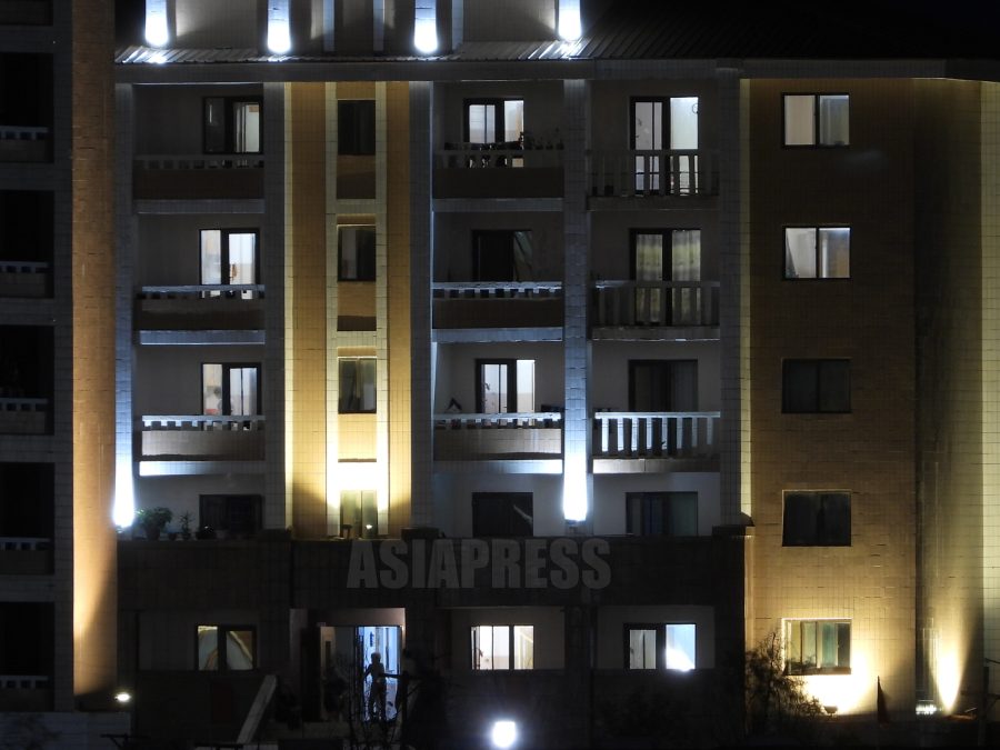 電力難が今も深刻な北朝鮮。しかしこの復興アパート一帯だけは、夜間に室内で明かりが灯り、外壁までライトアップされていた。少し下流の新義州市よりもはるかに明るく、電力が優先的に供給されているのが一目瞭然だった。モダンな復興住宅を外部に宣伝するのが狙いだろう。