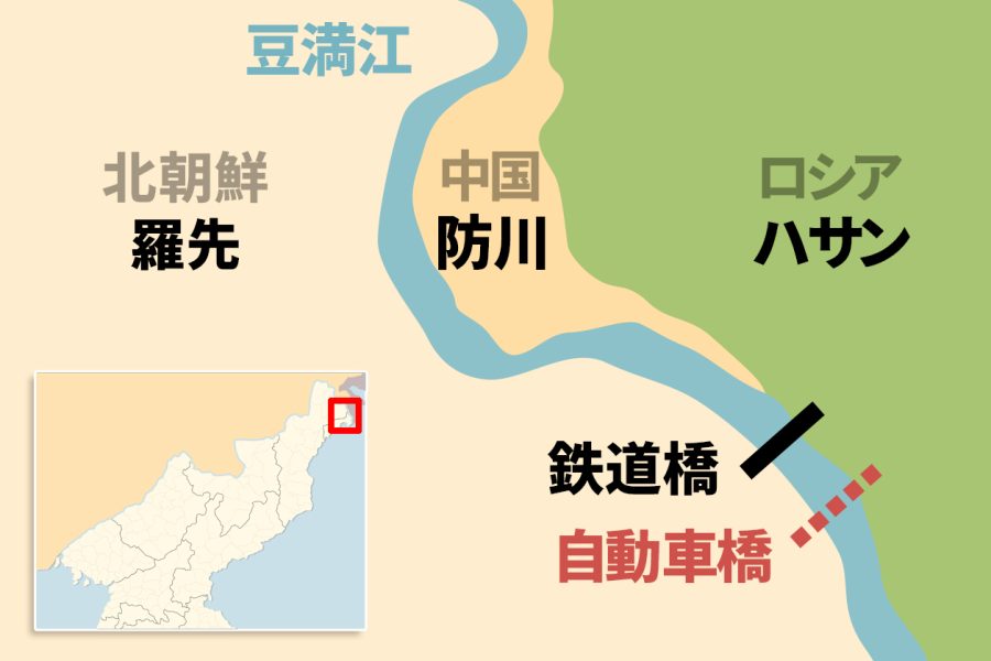 豆満江最下流の朝中ロの三国が接する国境地帯。これまで朝ロ間を陸路で繋ぐのは1959年に建設された鉄道橋しかなかった。北朝鮮・羅先とロシア・ハサンを結ぶ鉄道橋を通じて2022年末11月頃からロシアへ武器・弾薬が大量輸送されたとみられている。建設中の自動車橋は、鉄道橋より約500メートル下流に位置する。