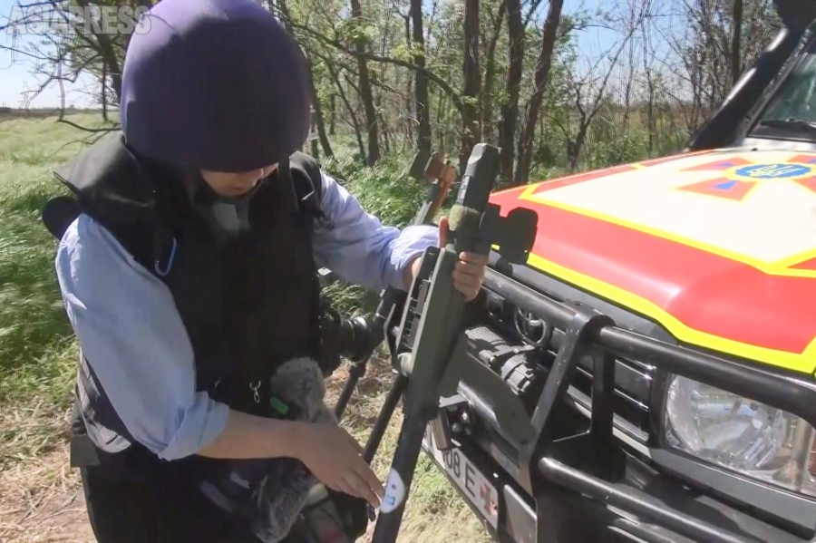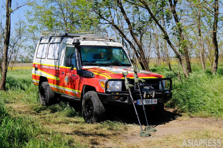 非常事態庁(DSNS)が使うトヨタのランドクルーザー車両も日本からの支援。爆破物処理の現場で活躍していた。(2024年5月・ヘルソン州ミルネ村・撮影・玉本英子)隊員が使う金属・地雷探知機は、日本のウクライナ支援として送られたものだ。