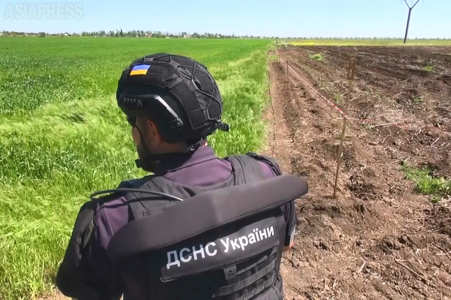 左が爆発物処理を終えた農地で麦が作付けされている。一方、右は未処理区域で、処理班が地雷除去機で撤去作業を進めていた。非常事態庁の処理班や車両もロシア軍の標的となっているため、自爆ドローンが飛来する20km圏内では活動を制限していた。(2024年5月・ヘルソン州ミルネ村・撮影・玉本英子)