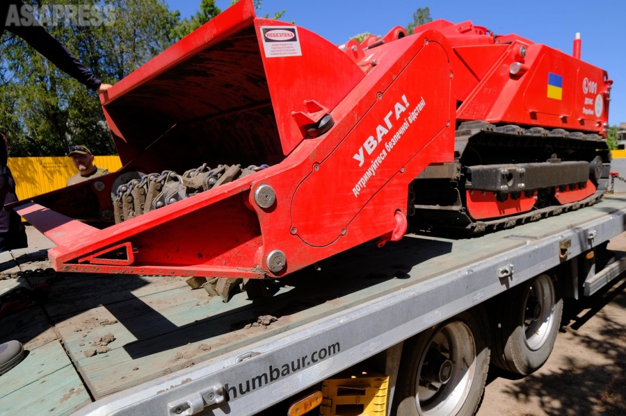 韓国ウクライナ支援プロジェクトで送られた地雷処理車両。クロアチア/DOK-ING社製のMV-4で遠隔操作によって運用される。(2024年5月・ヘルソン州ポサド・ポクロフスケ村・撮影・玉本英子)