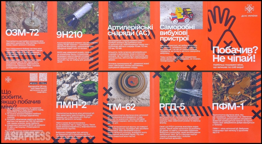 「見つけても触らないで」と爆発物への警告を促すパンフレット。ロシア軍が残した様々な爆発物を例示している。なかにはおもちゃに似せた仕掛け爆弾まである。(DSNSパンフレットより)次のページ: ◆北部ハルキウ州で投入された日本の処理車両... ↓