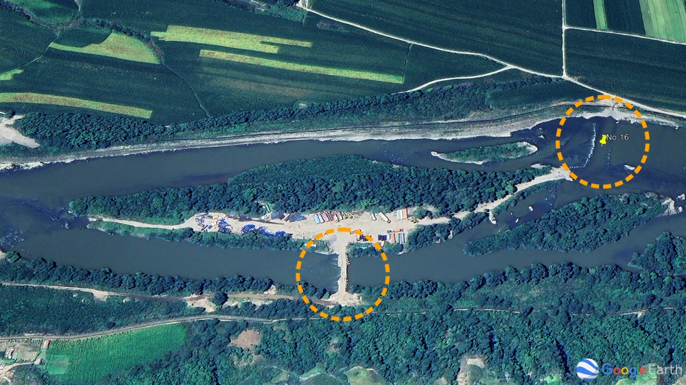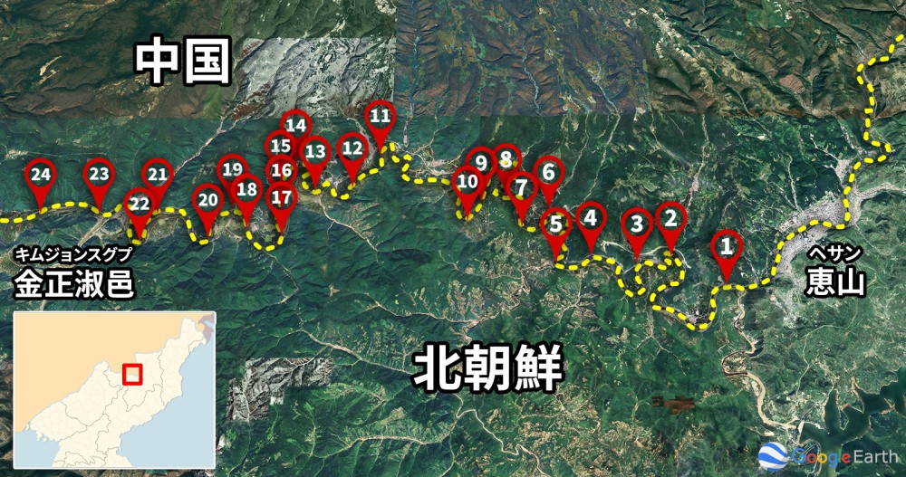 グーグルアースは、2025年7月31日と9月13日に鴨緑江上流地点を撮影した衛星写真を公開している。それを分析すると、北朝鮮の両江道(リャンガンド)恵山(ヘサン)市から金正淑(キムジョンスク)郡までの約80キロの区間で、密輸拠点と見られるポイントが24カ所あった。