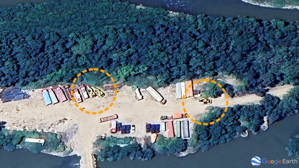 これら密輸ポイントと推定される現場には、掘削機をはじめとする重機があるのが確認できた。水深が浅く流れの速い地点で、車両が渡河できる「通路」を整備するためだろう。衛星写真には、実際に掘削機が川で作業している様子も写っていた。
