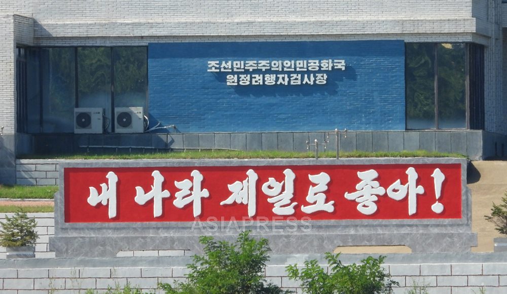 北朝鮮側の出入国管理施設を超望遠レンズで捉えた。「我が国が一番いい」という巨大スローガン碑石が中国側に向いて設置されている。「朝鮮民主主義人民共和国 元汀旅行者検査場」の表示が見える。