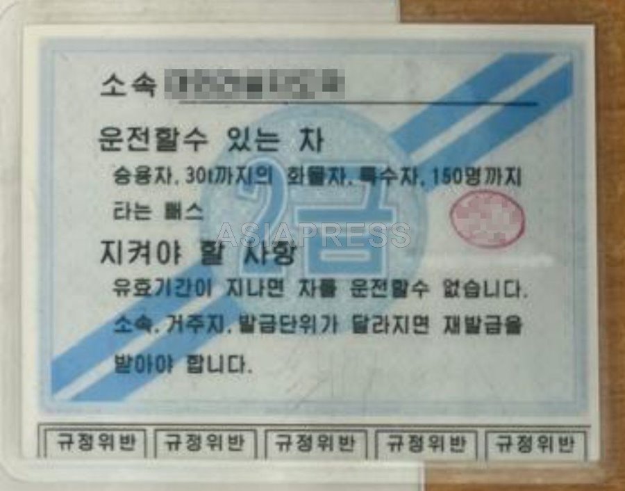 運転者が事故を起こしたり交通違反で検挙されたりすると、免許証下部の「規定違反」と記された部分に穴を開けられる。咸鏡北道の取材協力者B氏は次のように説明する。