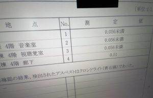2022年12月3日の測定では視聴覚教室内で空気1リットルあたり0.057本の石綿繊維を検出(石綿の種類記載なし)。