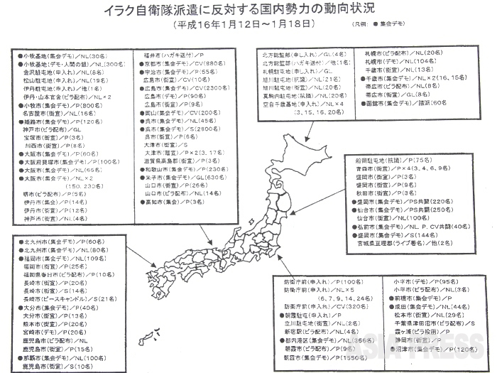 「1.16(金)、防衛庁における陸自先遣隊の編成完結式、隊員・装備の出国及び17日(土)のクウェート到着という自衛隊イラク派遣における陸上自衛隊の具体的な動きが始まった。派遣自体が本格的に始まった今週は、先週と比べ、総数的に再び急激に増加するとともに、内容的にも、大規模人員を動員した集会・デモ、自衛隊イラク派遣に関連する駐屯地及び基地に対する抗議行動が、中方〔中部方面〕筆頭に各地で行われた」