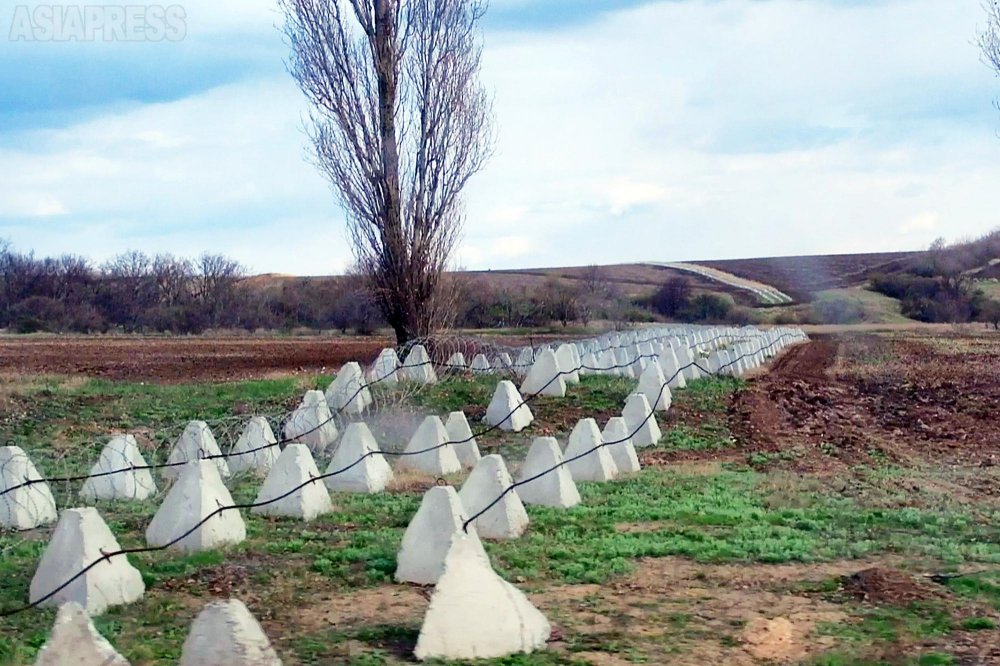 ハルキウ近郊のチュフイウからM03号線を外れ、東へと車を走らせる。道路わきの畑には、ロシア軍の進撃に備えて設置された「竜の歯」と呼ばれるピラミッド型のコンクリート防護ブロックが、丘向こうまで果てしなく伸びている。