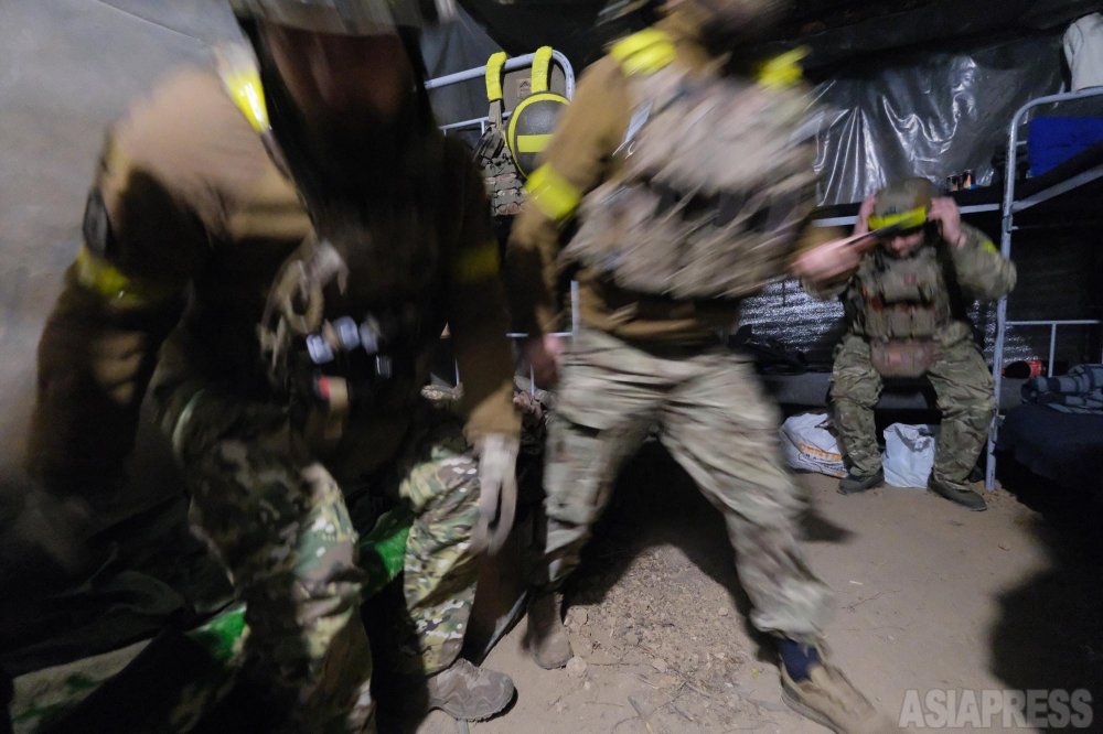 狭い退避壕のなかで、仲間どうしで話す兵士たちには笑みも浮かぶ。だが、ときおり、ふっと放心したような表情になる。