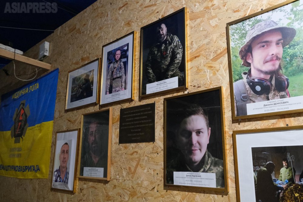 衛生中隊にも犠牲者が出ている。戦闘現場で負傷者の処置中や搬送時に自爆ドローンで狙われるほか、安定化拠点そのものが爆撃されることもある。 壁には、砲撃で戦死した仲間の兵士の顔写真が掲げられていた。命を救う衛生兵もまた、危険ななかで任務に向き合っている。