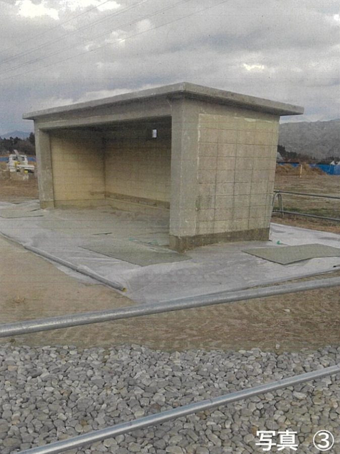 アスベストを含む仕上塗材が天井やブロック壁の表面に施工されていた工作物「ベンチシェルター(1)」のようす(撮影は同日午後3時ごろ)。周囲の敷かれたビニールシート上には、天井の石綿を含む仕上塗材除去で発生したとみられる「大量の粉じんが残存」していたが、真空掃除機による清掃がされていなかったという(飯島町提供)
