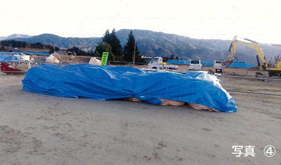 アスベスト除去した廃棄物や石綿除去せず解体したブロックなどの廃棄物の保管状況(2025年12月4日午前9時10分ごろ撮影)。降雪予報があったため、12月3日夕方に流出防止などを指示したが、町はシート養生の不備が12月5日午前でも「改善されていなかった」と指摘する。石綿を含む廃棄物の保管場であることを示す掲示や仮囲いもなかったという(飯島町提供)