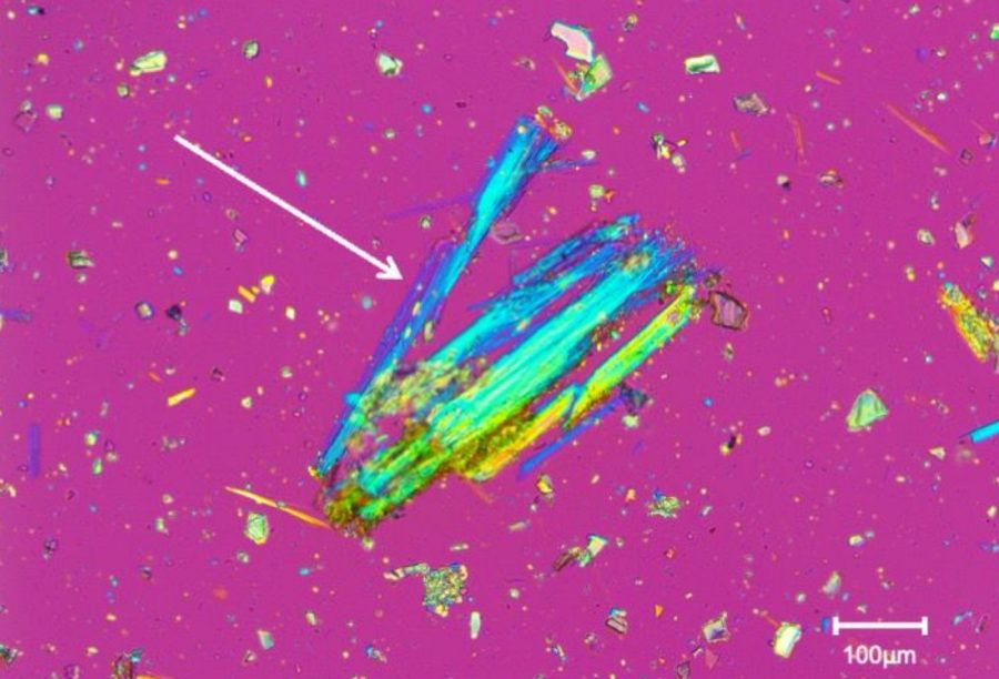 ahomeone Shop-JPの「[ahomeone]砂絵キット サンドアート セット」から「微量に検出」したトレモライト・アスベストの繊維束の顕微鏡写真