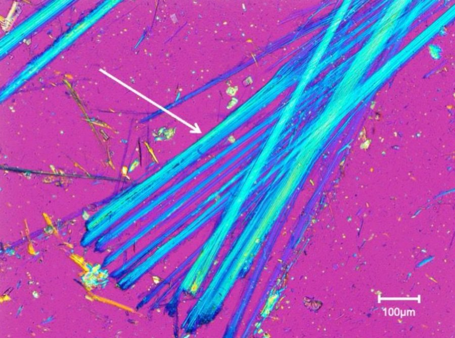 XuYuQianQiShangMaoの「マジックサンド FANTASTIC SAND 合計1.33ポンド/0.6kg XIZHI-MSHS-01」から「微量に検出」したトレモライト・アスベストの繊維束の顕微鏡写真