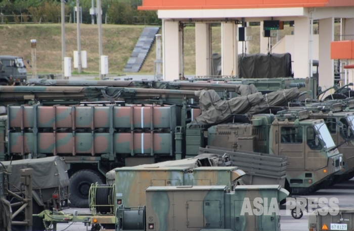 陸上自衛隊宮古島駐屯地の12式地対艦誘導弾(ミサイル)の発射筒を載せた車両(2023年12月5日撮影)