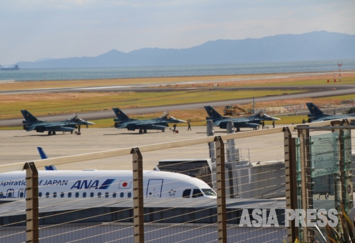 大分空港、全日空機の向こう側で航空自衛隊F2戦闘機の機体点検がおこなわれた(2023年11月13日撮影)