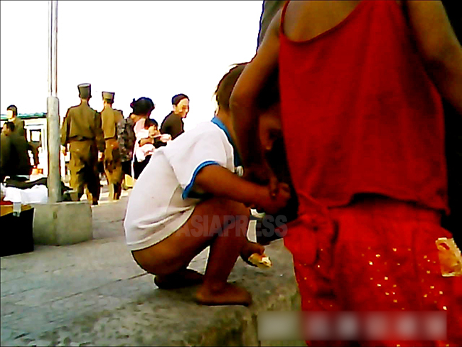 姉弟だろうか、古着をまとった女の子と小さな男の子が互いに手を携えて街の中心部を徘徊している。男の子はパンツをはいていない様子だ。2013年9月平安南道の平城市にて撮影アジアプレス