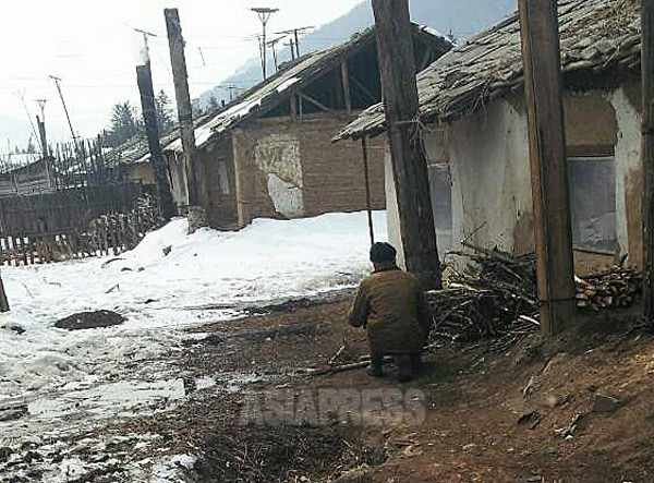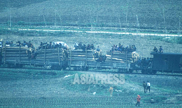 혹한에 퇴비 모으기에 동원된 여성들. 2015년 1월 중순 북한 중부에서 촬영 김동철(아시아프레스)목재 운반 화차를 타고 농촌에서 도시로 이동하는 사람들. 대부분이 여성이었다. 최악의 기근 중이었던 1998년 가을 두만강을 끼고 중국 측에서 촬영 이시마루 지로나무 굴뚝, 무너질 듯한 지붕. 지방의 피폐한 농촌 모습이다. 여성이 땔나무를 자르고 있다. 2015년 3월 촬영 리준(아시아프레스)