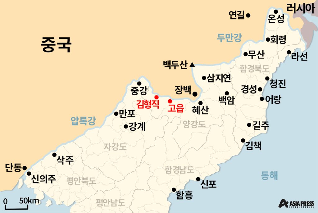 취재협력자가 10월 중순에 알려온 밀수의 구체적인 장소는 혜산시에서 약간 하류 지점에 위치한 김형직군과 고읍 부근이라고 한다.