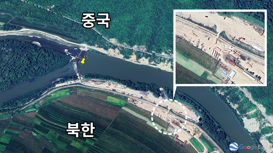 압록강 상류의 하중도가 밀수 거점으로 변모했다. 대형 트럭 수십 대를 확인할 수 있다. 2025년 9월 13일 현재 구글어스 위성 사진