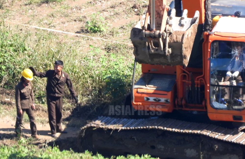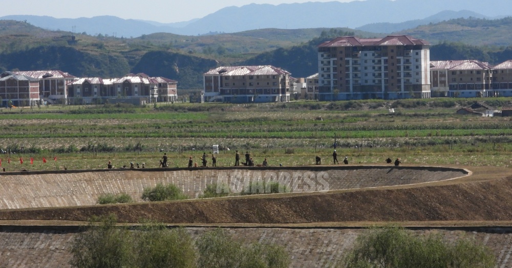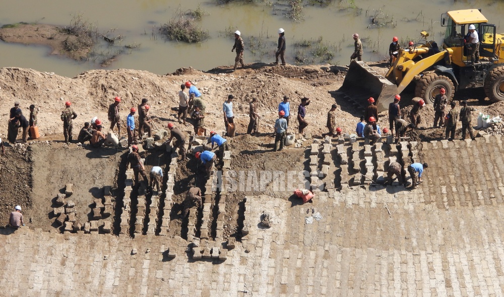 The lower Yalu River region where recovery work from late July last year's torrential rains continues. In Uiju County bordering Sinuiju in Pyongan Province, new apartments have been completed, and massive embankment construction was underway along the riverbank. The embankment, piled up like a castle wall, revealed the determination to never repeat flood damage again. Numerous military soldiers were also mobilized at this construction site. When lunchtime came, they gathered together and hurriedly ate enormous amounts of corn rice. (ASIAPRESS Editorial Team)
