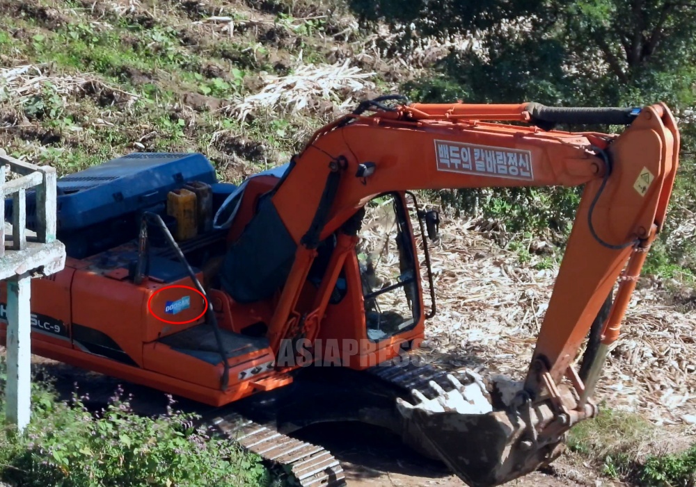 Heavy equipment from Doosan, a major South Korean heavy industry manufacturer, was being utilized. The equipment may have been manufactured in China. While the logo remains intact, slogans reading "Baekdu's Cutting Wind Spirit" and "Ten Thousand Miles Following the Party’s Center" are attached to both sides of the boom section.