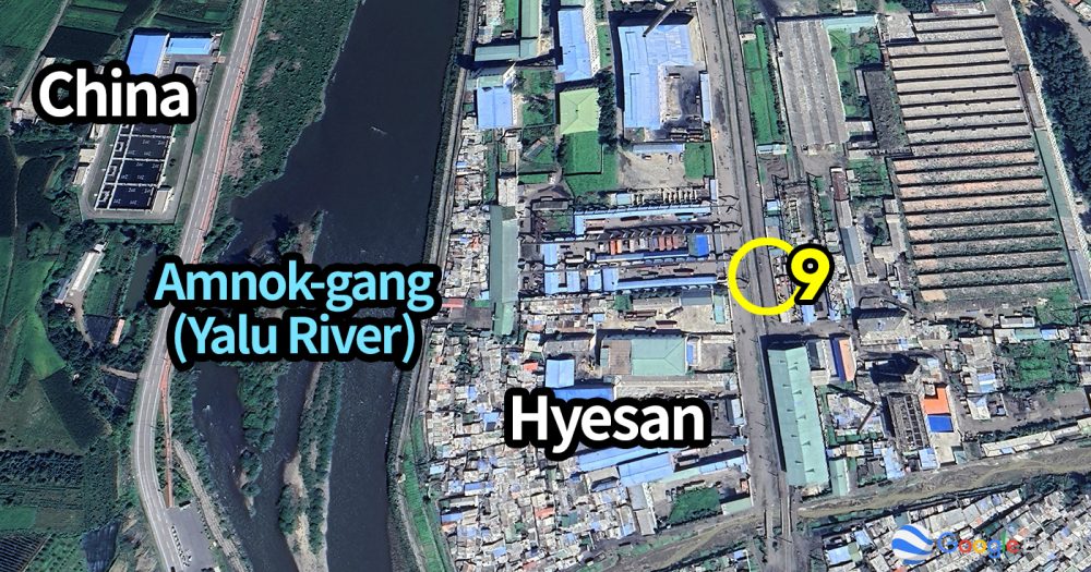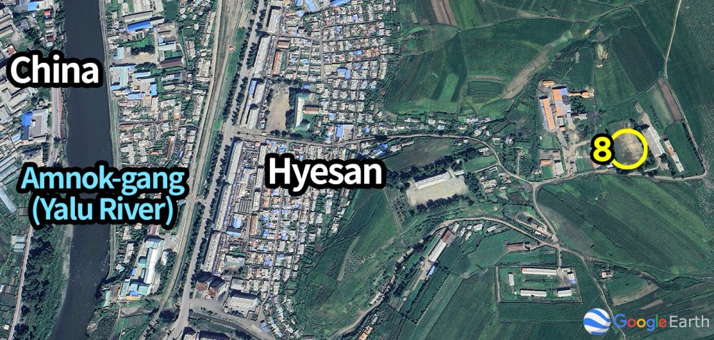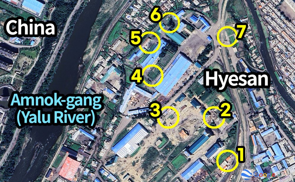 Google Satellite Image 1: Marked on Google Maps are the locations of smuggling vehicles parked throughout Hyesan's Gangan-dong neighborhood.