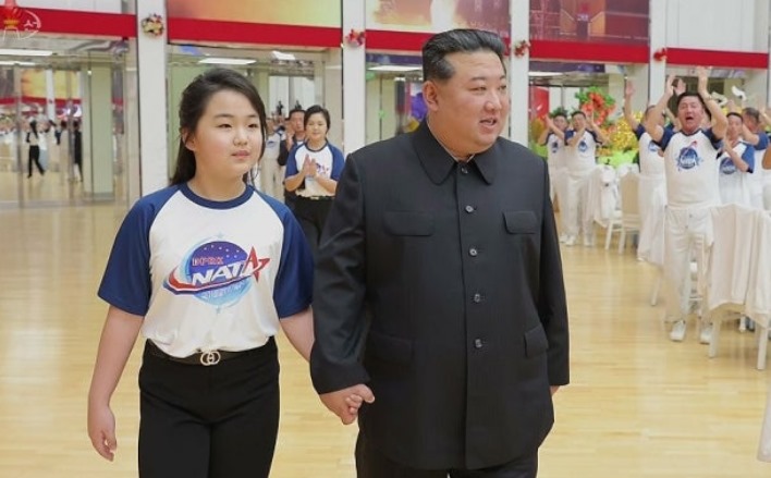 The daughter appears holding hands with Kim Jong-un at a banquet celebrating the successful launch of a reconnaissance satellite. She was estimated to be 11 years old at the time. From Korean Central TV, November 2023.